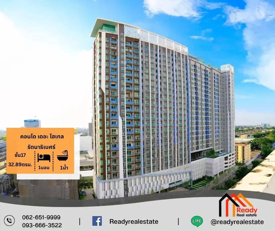 ขายคอนโด เดอะ โฮเทล รัตนาธิเบศร์ พื้นที่ใช้สอย 32.89 ตรม. ชั้น 17 คอนโดสูง 25 ชั้น อยู่ชั้น 17 พื้นที่ใช้สอย32.89 ตรม. 1 ห้องนอน 1ห้องน้ำ ค่าส่วนกลาง: 38 บาท/ ตรม. โครงการ: คอนโด เดอะ โฮเทล รัตนาธิเบศร์ ที่ตั้ง : ตำบลบางกระสอ อำเภอเมืองนนทบุรี จังหวัดนนทบุรี 11000 Google Map : https://share.google/DpZLow1ZSVyHLaYBq ราคาขาย 2,000,000 บาท สิ่งอำนวยความสะดวก -สระว่ายน้ำ - ฟิตเนส - สนามเด็กเล่น - ห้องอเนกประสงค์ - ระบบ CCTV / Access Card -ระบบรักษาความปลอดภัย 24 ชม. จุดเด่น -ห้องสวยพร้อมอยู่ - ใกล้สถานีรถไฟฟ้าสายสีม่วงและสีชมพู - อยู่ใกล้แหล่งอำนวยความสะดวกมากมาย -จัดสินเชื่อฟรี สถานที่ใกล้เคียง - บิ๊กซี รัตนาธิเบศร์ - เซ็นทรัล รัตนาธิเบศร์ - โรงพยาบาลพระนั่งเกล้า - ศูนย์ราชการ จังหวัด นนทบุรี - อุทยานมกุฏรมย์สราญ - Esplanade แคราย-งามวงศ์วาน - โรงพยาบาลทรวงอก - กระทรวงสาธารณสุข - พันธ์ทิพย์พลาซ่า งามวงศ์วาน สนใจสอบถามรายละเอียดเพิ่มเติม คุณออย เบอร์โทรศัพท์ 062-651-9999 /093-666-3522 Line: @ readyrealestate