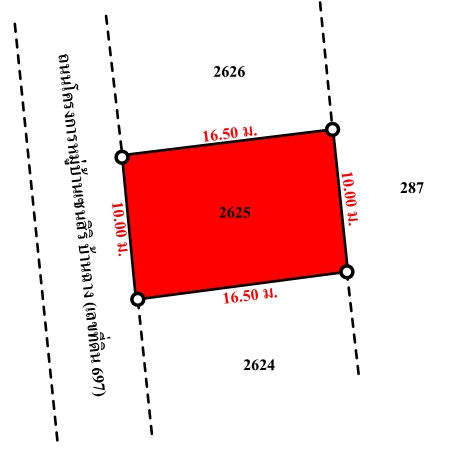 ที่ดินเป็นรูปสี่เหลี่ยมผืนผ้า ขนาดแปลงที่ดินด้านทิศตะวันตกติดถนน กว้างประมาณ 10 ม. ลึกประมาณ 16.5 ม.