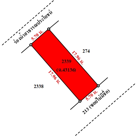 ที่ดินเป็นรูปสี่เหลี่ยมผืนผ้า ขนาดแปลงที่ดินด้านทิศใต้ติดถนน กว้างประมาณ 5.7 ม. ลึกประมาณ 17.96 ม. และด้านทิศเหนือติดร่องน้ำสาธารณประโยชน์ กว้างประมาณ 5.7 ม.