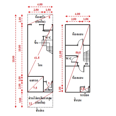 ที่ดินเป็นรูปสี่เหลี่ยมผืนผ้า ขนาดแปลงที่ดินด้านทิศเหนือติดถนน กว้างประมาณ 4 ม. ลึกประมาณ 18 ม.
