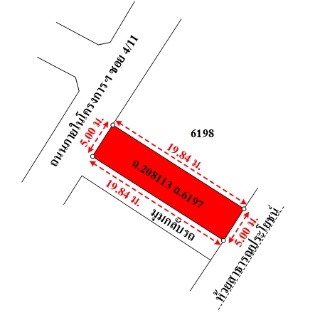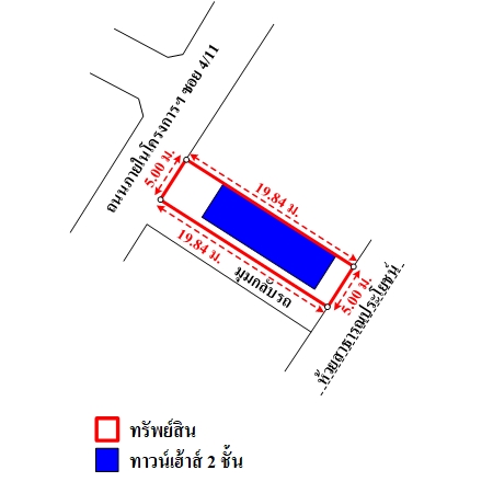 ที่ดินเป็นรูปสี่เหลี่ยมผืนผ้า ขนาดแปลงที่ดินด้านทิศตะวันตก ติดถนน กว้างประมาณ 5 ม. ลึกสุดประมาณ 19.84 ม.