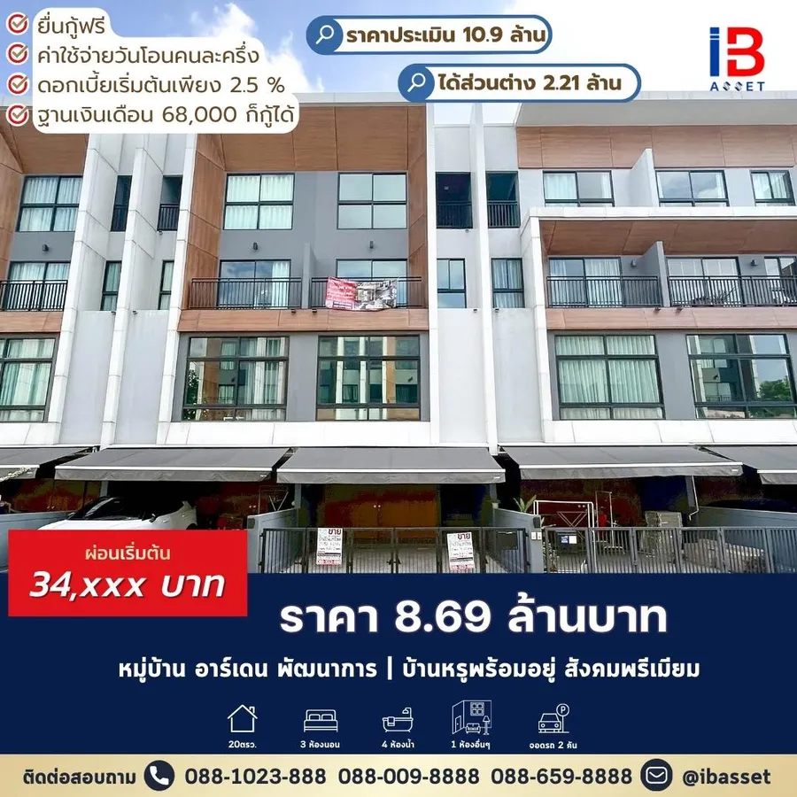 บ้านหรูพร้อมอยู่ ใกล้ทองหล่อ-เอกมัย เพียงไม่กี่นาที สังคมพรีเมียม สิ่งอำนวยความสะดวกครบครันราคา 8.69 ล้านบาท อย่าช้า! 🏡โครงการ : Arden พัฒนาการ ที่ตั้ง : ซอยพัฒนาการ 20 แขวงสวนหลวง เขตสวนหลวง กรุงเทพมหานคร 10250 พิกัด : https://maps.app.goo.gl/QPCrScC7m79ydy1G8 รหัสทรัพย์ : TH0106 ราคา 8,690,000 บาท ✨ ค่าใช้จ่ายวันโอนทั้งหมดคนละครึ่ง ✨ ประเภท : บ้าน จำนวน : 3.5 ชั้น พื้นที่ : 0 ไร่ – 0 งาน - 20 ตร.ว. พื้นที่ใช้สอย : 185 ตร.ม. ห้องนอน : 3 ห้องนอน ห้องน้ำ : 4 ห้องน้ำ ห้องอื่นๆ : 1 ห้อง ที่จอดรถ: 2 คัน 🌟จุดเด่นโครงการ : - ระบบไฟฟ้า 3 เฟส สายไฟลงดินทั้งหมู่บ้าน ทัศนียภาพสวยไม่มีสายไฟเกะกะระโยงรยางค์ – Clubhouse – สวนหย่อม-พื้นที่สีเขียว Arden park – Jogging Track & Bicycle Lane – Fitness center – สระว่ายน้ำยาว 25 เมตร – CCTV – รปภ. 24 ชม. 🏢ทำเล สถานที่ใกล้เคียง : - ทางด่วน 1.6km. - รถไฟฟ้าสายสีน้ำตาล 2.5km. - ทองหล่อ 8km. - The Nine rama9 7.3km. - โรงพยาบาลกรุงเทพ 4.3km. - โรงพยาบาลปิยะเวช 5.7km. - โรงพยาบาลสมิติเวช 5.4km. - โรงพยาบาลบำรุงราษฎร์ 7.6km. - Central rama9 7.8km. 📞 สนใจติดต่อ Line : @ibasset ☎️ 065-727-9031 เซลล์ กร