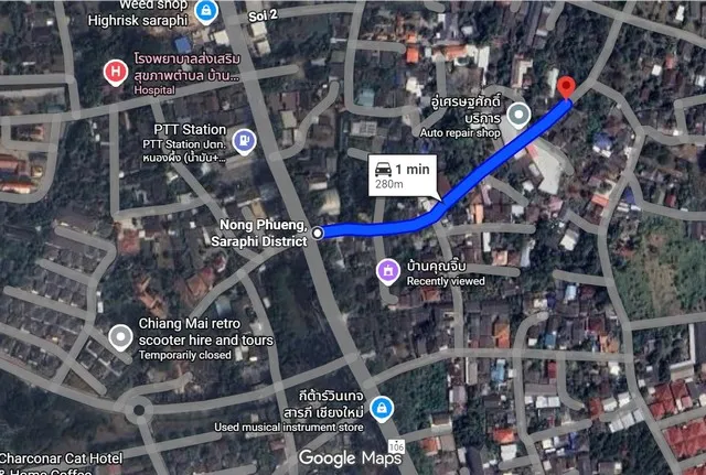 ทางเข้าไปประมาณ 280 เมตร จากถนนต้นยางเชียงใหม่-ลำพูน ติดอู่รถยนต์เศรษฐศักดิ์ ต.หนองผึ้ง อ.สารภี จ.เชียงใหม่
