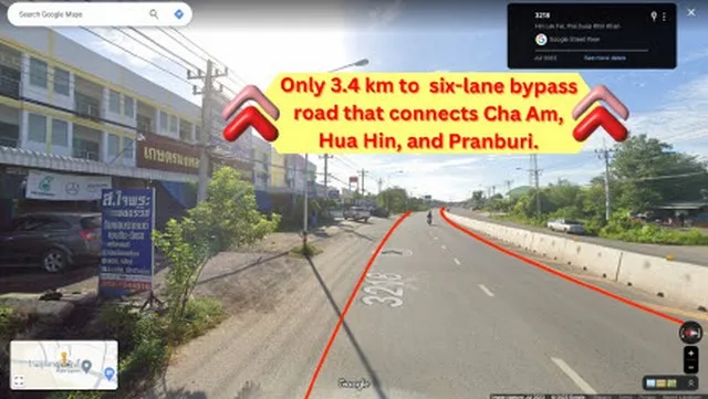 1) ที่ดินห่างจากสี่แยกบายพาสหัวหิน สามารถเชื่อมไปถนนชะอำ-ปราณบุรี 3.4 กม. (4 นาที)