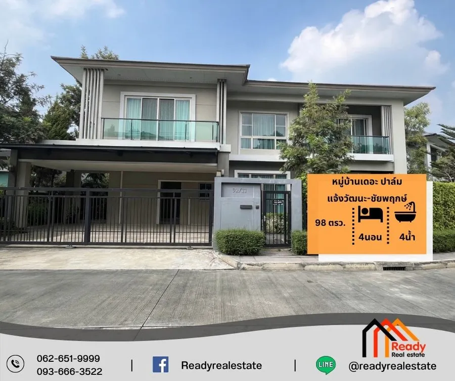 ขาย 13.9 ล้าน บ้านเดี่ยว 2 ชั้น 98 ตร.ว หมู่บ้านเดอะ ปาล์ม แจ้งวัฒนะ-ชัยพฤกษ์ บ้านเดี่ยว 2 ชั้น เนื้อที่ 98ตารางวา พื้นที่ใช้สอย 308 ตารางเมตร 4 ห้องนอน 4 ห้องน้ำ 1 ห้องครัว 1 ห้องรับแขก 1 ห้องทำงาน 1 ห้องแม่บ้าน 2 ที่จอดรถ แอร์ 5 ตัว -ปูพื้นชั้นล่าง: แกรนิโต้ /ปูพื้นชั้นบน: ลามิเนต - ต่อเติมหลังคาจอดรถ -หันหน้าทิศใต้ -ค่าส่วนกลาง: 3,600 บาท / เดือน ชื่อโครงการ : หมู่บ้านเดอะ ปาล์ม แจ้งวัฒนะ-ชัยพฤกษ์ ที่ตั้ง : ตำบล บางตะไนย์ อำเภอปากเกร็ด นนทบุรี 11120 พิกัด : https://share.google/xH46DlJwUNpyNEpKd ราคาขาย 13,900,000 บาท จุดเด่น -โครงการคุณภาพจากพฤกษา -หมู่บ้านเงียบสงบ - ถนนโครงการกว้าง 12 เมตร -ออกได้ทาง 2 เส้นทาง ทั้งเส้นชัยพฤกษ์ และ เส้น 345 - จัดสินเชื่อฟรี สิ่งอำนวยความสะดวก -คลับเฮ้าส์ Luxury Lounge - สระว่ายนํ้า -ห้องออกกำลังกาย - Co-working Space -สวนสาธารณะ / Jogging Track -สนามฟุตซอล -ระบบ Keycard -กล้อง CCTV, เจ้าหน้าที่รักษาความปลอดภัย 24 ชม. สถานที่ใกล้เคียง -เซ็นทรัลพลาซ่า แจ้งวัฒนะ 8 กม. - เดอะ คริสตัล พีทีที ชัยพฤกษ์ 6 กม. - โรบินสันไลฟ์สไตล์ ราชพฤกษ์ 7 กม. - โลตัส นอร์ธ ราชพฤกษ์ 9 กม. - เซ็นทรัล พลาซ่า เวสต์เกต 16 กม. -Harrow International School Bangkok 10 กม. - โรงเรียนสวนกุหลาบนนทบุรี 7 กม. -โรงพยาบาลวิภารามปากเกร็ด 6 กม. - โรงพยาบาลกรุงไทย 7 กม. สนใจสอบถามรายละเอียดเพิ่มเติม คุณออย เบอร์โทรศัพท์ 062-651-9999 / 093-666-3522 Line: @ readyrealestate