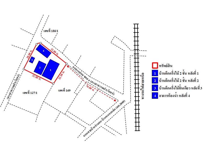 ที่ดินเป็นรูปคล้ายสี่เหลี่ยมคางหมู ตั้งอยู่ติดถนน 2 ด้าน ขนาดแปลงที่ดินด้านทิศเหนือ กว้างประมาณ 32 ม. และด้านทิศตะวันตก ลึกสุดประมาณ 28 ม.