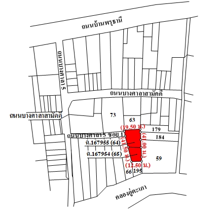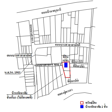 ที่ดินจำนวน 2 แปลงติดต่อกัน เป็นรูปสี่เหลี่ยมคางหมู ขนาดแปลงที่ดินด้านทิศตะวันตก กว้างประมาณ 41.5 ม. (ส่วนที่ติดถนน กว้างประมาณ 7.5 ม.) ลึกสุดประมาณ 19.5 ม.