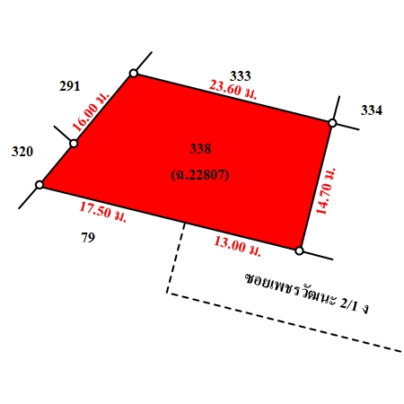 ที่ดินเป็นรูปสี่เหลี่ยมคางหมู ขนาดแปลงที่ดินด้านทิศใต้ กว้างประมาณ 30.5 ม. (ส่วนที่ติดถนน กว้างประมาณ 13 ม.) ลึกสุดประมาณ 16 ม.