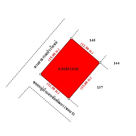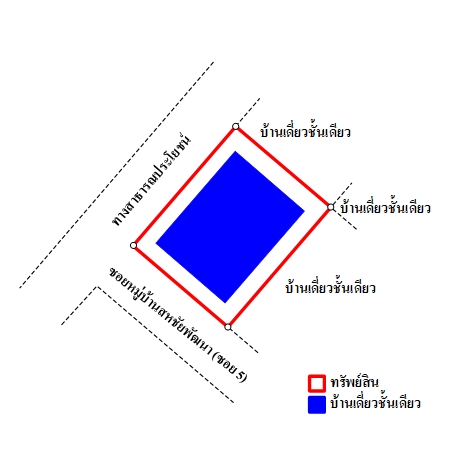 ที่ดินเป็นรูปสี่เหลี่ยมผืนผ้า ตั้งอยู่ติดถนน 2 ด้าน ขนาดแปลงที่ดินด้านทิศใต้ กว้างประมาณ 13 ม. และด้านทิศตะวันตก กว้างประมาณ 15 ม. ลึกประมาณ 15 ม.