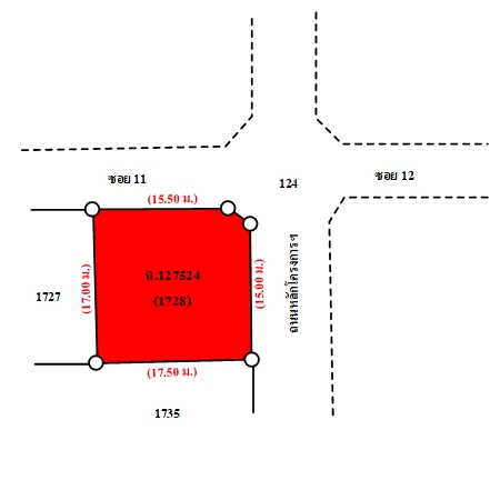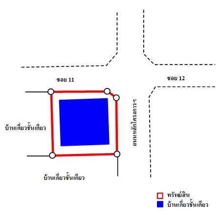 ที่ดินเป็นรูปสี่เหลี่ยมผืนผ้า ตั้งอยู่ติดถนน 2 ด้าน ขนาดแปลงที่ดินด้านทิศเหนือ กว้างประมาณ 15.5 ม. และด้านทิศตะวันออก กว้างประมาณ 15 ม. ลึกประมาณ 17 ม.