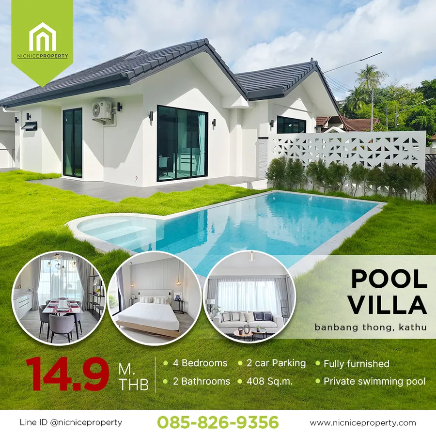 🏡 Brandnew Private Pool villa in Kathu Fully Furnished Ready to moving in 🎉 📍 Location : Baan Bang Thong, Kathu, Phuket 💵 Price 14,900,000 baht Details: 📐 House Area 132 sq.m 📐 Land area 408 sq.m. 🛌 4 bedrooms 🚿 2 bathrooms 🍽 1 kitchen 🛋️ 1 living room 🏊 Private swimming pool 🚗 2 Parking lots Nearby places: ✅ 2-3mins - Bangwad Dam ,7-11 ✅ 10 mins - Supermarket - Central /Makro / Big-C /Tesco lotus Phuket ✅ 15mins - Patong Beach ------------ 🏡 ขาย Pool Villa กะทู้ 102ตร.วา. ใกล้ห้าง Central เพียง 10นาที พร้อมย้ายเข้าอยู่ ✅ 📍 พิกัด หมู่บ้านบางทอง กะทู้ ภูเก็ต เดินทางไปหาดป่าตองเพียง 15 นาที 💵 ราคา 14,900,000 บาท รายละเอียด : 📐 เนื้อที่ 408 ตารางเมตร 📐 พื้นที่ใช้สอยภายในบ้าน 132 ตารางเมตร 🛌 4 ห้องนอน 🚿 2ห้องน้ำ 🍽 1 ห้องครัว 🛋️ 1 ห้องนั่งเล่น 🏊 สระว่ายน้ำส่วนตัว 🚗 พื้นที่จอดรถ 2 คัน ✅ พร้อมเข้าอยู่ เฟอร์นิเจอร์ครบชุด สถานที่ใกล้เคียง : ✅ 2-3 นาที เขื่อนบางวาด, 7-11 ✅ 10 นาที เซ็นทรัล, แม็คโคร, บิ๊กซีภูเก็ต ✅ 15 นาที หาดป่าตอง ------------------------------------------------------------------------ Map : https://maps.app.goo.gl/2UTu5ovuk6zafcr9A ------------------------------------------------------------------------ For more information, please contact / สนใจสอบถามข้อมูลเพิ่มเติม 📱 โทร : 085-8269356 ป้อ 🟩 ไลน์ : https://line.me/ti/p/f4AQ5RDe_e