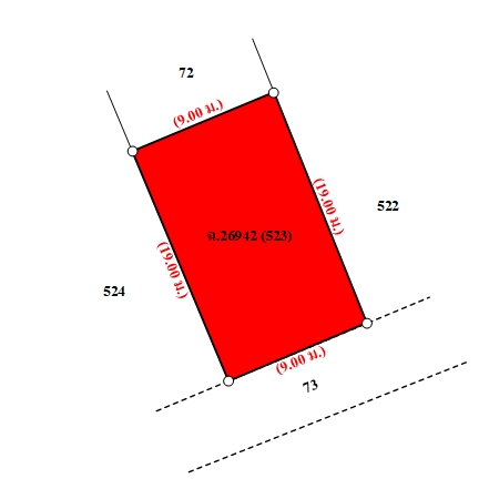 ที่ดินเป็นรูปสี่เหลี่ยมผืนผ้า ขนาดแปลงที่ดินด้านทิศใต้ติดถนน กว้างประมาณ 9 ม. ลึกประมาณ 19 ม.