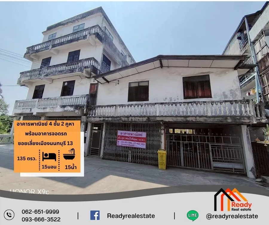 ขายอาคารพาณิชย์ 4 ชั้น 2 คูหา พร้อมอาคารจอดรถ ซอยเลี่ยงเมืองนนทบุรี 13 เนื้อที่ 135 ตรว.