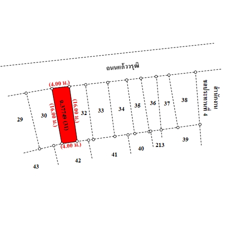 ที่ดินเป็นรูปสี่เหลี่ยมผืนผ้า ขนาดแปลงที่ดินด้านทิศเหนือติดถนน กว้างประมาณ 4 ม. ลึกประมาณ 16 ม.