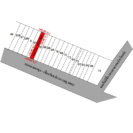 ที่ดินเป็นรูปสี่เหลี่ยมผืนผ้า ขนาดแปลงที่ดินด้านทิศใต้ติดถนน กว้างประมาณ 4 ม. ลึกประมาณ 30 ม.