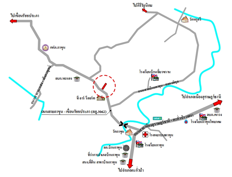ถนนผ่านหน้าทรัพย์สิน ได้แก่ ถนนสายตาขุน-เขื่อนรัชชประภา (สฎ.3062) เป็นทางสาธารณประโยชน์ ผิวจราจรลาดยาง กว้างประมาณ 8 ม. เขตทางกว้างประมาณ 30 ม.