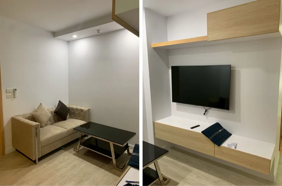 35 ตรม 1 ห้องนอน 1 ห้องน้ำ 1 ห้องนั่งเล่น อาคาร V8 เฟอร์นิเจอร์ครบ เครื่องใช้ไฟฟ้าครบ มีเครื่องซักผ้า