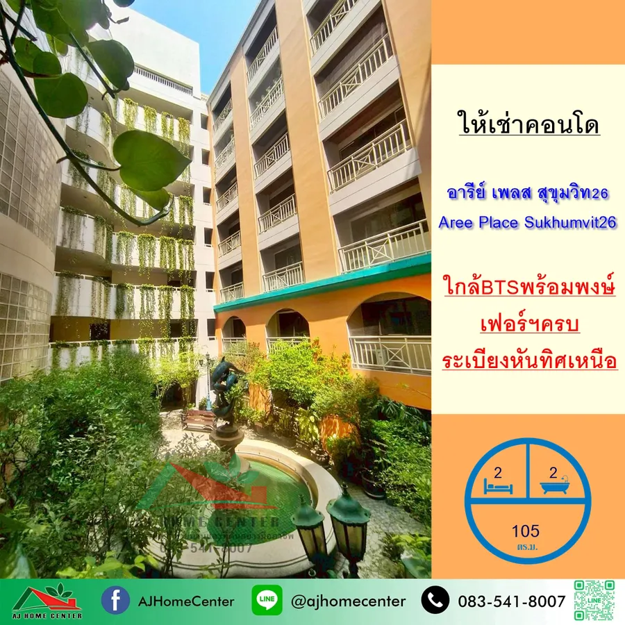ให้เช่าคอนโดอารีย์ เพลส สุขุมวิท26 ขนาด105ตรม. ชั้น3 ห้องสภาพดี ระเบียงหันทิศเหนือ . คอนโด Low rise สูง8ชั้น พื้นที่ใช้สอย 105 ตารางเมตร ชั้น3 2ห้องนอน 2ห้องน้ำ 1ห้องรับแขก 1ห้องครัว แอร์ 3 ตัว . ที่ตั้งทรัพย์สิน : คอนโดอารีย์ เพลส สุขุมวิท26 / Aree Place Sukhumvit26 ซ.สุขุมวิท26 (ซ.ท่านผู้หญิงพวงรัตน์ประไพ) แขวงคลองตัน เขตคลองเตย กรุงเทพฯ พิกัดโครงการ : https://maps.app.goo.gl/5L9Wn6fUgDzySru68 . ราคาเช่า 35,000 บาท/เดือน (รวมค่าส่วนกลาง) . สิ่งอำนวยความสะดวกในโครงการ - ฟิตเนส - สระว่ายน้ำ - ระบบคีย์การ์ด - กล้อง CCTV - ที่จอดรถ - รปภ. 24 ชั่วโมง . จุดเด่น - ห้องสภาพดี เฟอร์นิเจอร์ครบพร้อมอยู่ - ระเบียงหันทิศเหนือ ทิศดี ลมดี - โครงการอยู่ห่างจากถนนสุขุมวิท เพียง 300 เมตร - เข้า-ออกได้หลายเส้นทาง ทั้ง ซ.สุขุมวิท26 และ ซ.สุขุมวิท24 , - เชื่อมต่อไปยังถนนพระราม4 และถนนสุขุมวิทได้สะดวกมาก - ใกล้รถไฟฟ้า BTS สถานีพร้อมพงษ์ (ทางออก4) และสถานีทองหล่อ . สถานที่ใกล้เคียง - ศูนย์การค้า ดิ เอ็มโพเรี่ยม - เทสโก้ โลตัส เอ็กซ์ตร้า พระราม4 - เอ็มควอเทียร์ - โรงพยาบาลเทพธารินทร์ - โรงพยาบาลสมิติเวชสุขุมวิท - เทอร์มินอล21 อโศก - โรบินสัน สุขุมวิท - มหาวิทยาลัยศรีนครินทรวิโรฒ (มศว.) - มหาวิทยาลัยกรุงเทพ (กล้วยน้ำไท) . สนใจติดต่อ คุณหนึ่ง เบอร์โทรศัพท์ 061-545-9615 / 083-541-8007 / 02-101-2393