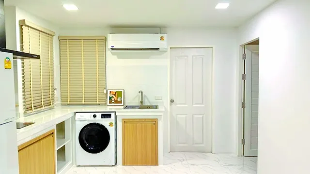 ครัวบิวท์อิน พร้อมเตาไฟฟ้า เครื่องดูดควัน ตู้เย็น และเครื่องซักผ้าอบผ้า
