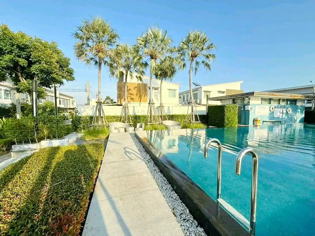 Street market 800m. WatKuSrang 900m. DoHome ToGo PrachaUthit90 1km. Two story townhome for rent 2 beds 3baths KuSang Market 1km 25sq.w.a 200sq.m. KuSrang Market 1km. rental price 11,999 B-M English style lush atmosphere fully furnished company registration possible suitable for residence home office and online sales convenient transportation near BTS Samrong