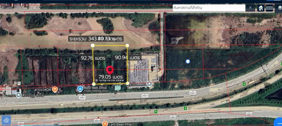 สำนักงาน ร้านอาหาร - แปลงรูปสี่เหลี่ยม ใช้งานง่าย :: รายละเอียด :: - ขนาดที่ดิน 4-2-84ไร่ - หน้ากว้าง 79 เมตร ลึก