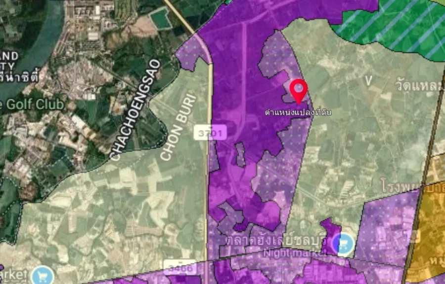 ขาย ที่ดิน ME399 EEC สีม่วงเข้ม ติดนิคมอมตะชลบุรี บางนาง พานทอง ชลบุรี . 6 ไร่ 2 งาน รูปแปลงทรงสี่เหลี่ยม ทำเลดี ราคาถูกสุดในย่านนี้