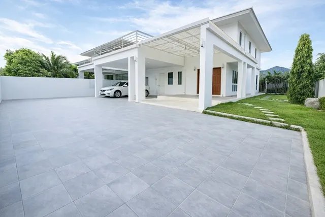 จอดรถได้ 3 ถึง 4 คัน พื้นที่กว้าง เทพื้นรองรับอย่างดี มีถังน้ำและปั๊มน้ำ ระบบพร้อมใช้งานทันที