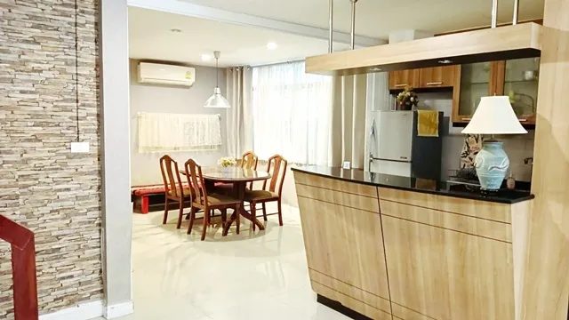 และห้องรับประทานอาหารขนาดกว้าง ครัวออกแบบใหม่พร้อมบาร์เก็บของ