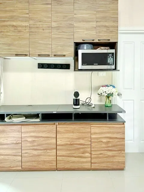 ตกแต่งพร้อมอยู่ แอร์ 4 เครื่อง ผ้าม่านครบ ชุดเคาน์เตอร์ครัวพร้อมที่ดูดควัน เตาแก๊ส ตู้ครัวลอย ตู้เย็น ไมโครเวฟ
