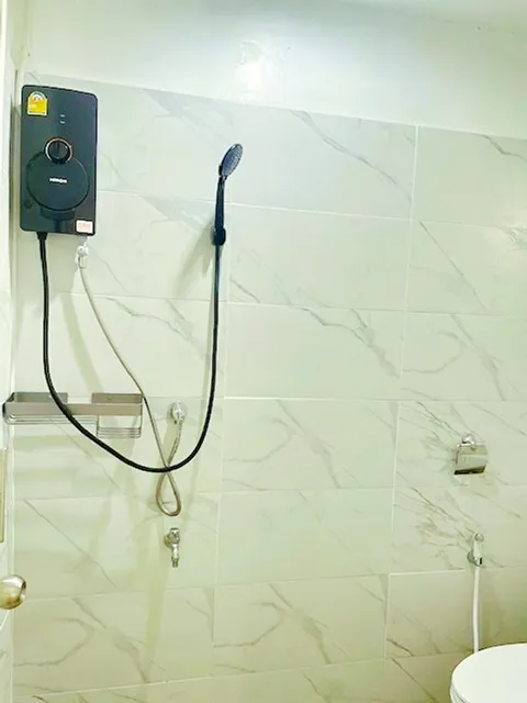 ภายในตกแต่งครบ มีแอร์ 2 เครื่อง เครื่องทำน้ำอุ่น เตียงนอน ตู้เสื้อผ้า และพื้นที่ครัวพร้อมตู้เย็น และพัดลมระบายอากาศ
