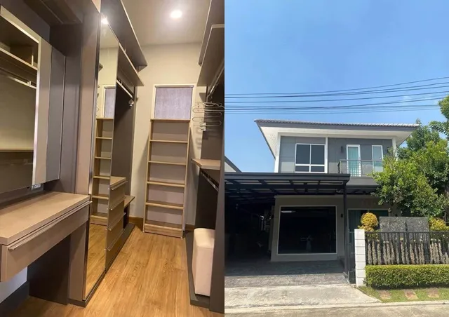 ชั้น 1: มีครัวฝรั่ง มีครัวไทย มีห้องน้ำ ห้องทำงาน มีแอร์ 2 ตัว ทีวี 2 เครื่อง ตู้เย็น 2 ตู้ หน้าบ้านจอดรถได้