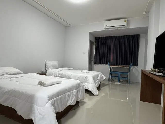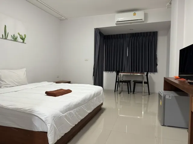 1) ห้องพักใหม่เอี่ยม และมีขนาดห้องกว้าง ที่มาพร้อมกับเฟอร์นิเจอร์ และแอร์