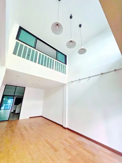 ชั้นล่างเป็นโถงกว้าง พื้นที่โล่ง เพดานสูง โปร่งสบาย ต่อเติมพื้นที่ด้านหลังเต็ม สามารถใช้งานได้จริง เหมาะทำพื้นที่ทำงานหรือโชว์รูม